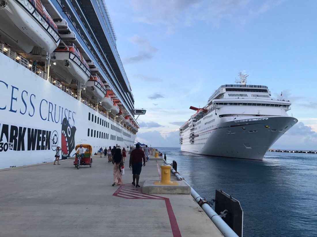 This morning we left the hotel at 11:30 am, called a taxi & paid $7.30 to get to the port. A port shuttle from the hotel cost $6 per person, which was very expensive compared to going by taxi. Besides, the shuttle didn’t stop at just the Princess pier but to all piers where there were ships docked. Today there were Carnival Conquest & RCI’s mega ship Harmony of the Seas.