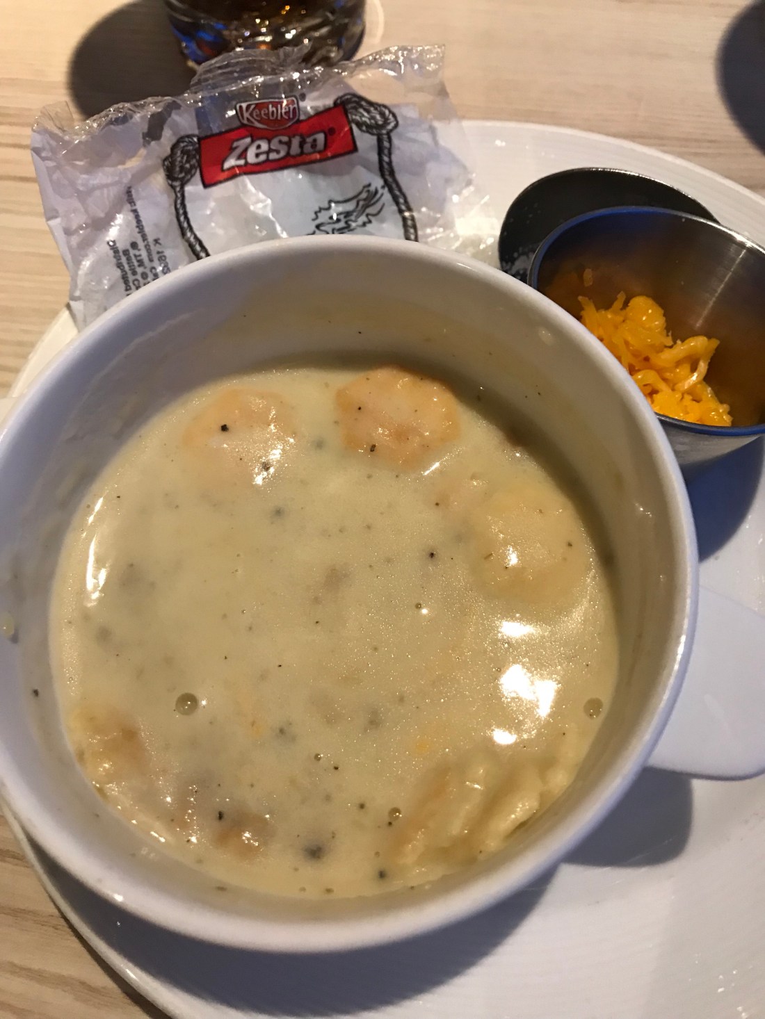 We vacated our stateroom just before 8 am & went up one deck to have our breakfast at Steamers Seafood. It was another good thing to have a stateroom on Deck 14 (Riviera) as it was easy to walk up one deck to get food and drinks, even with carry-on’s in our hands. Steamers was packed at that time.