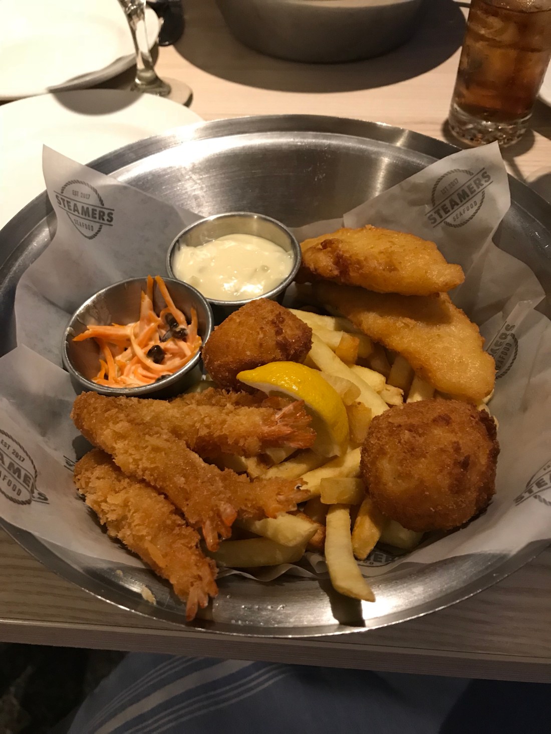 The service was excellent. The chowder was yummy. The fried seafood platter was above average but I would recommend paying the extra $10 for the mouth-watering lobster & king crab.