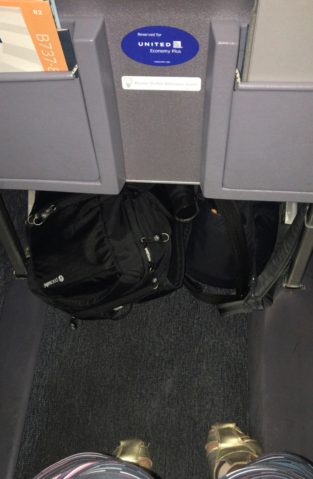 However, this flight type is different. Not only was there extra legroom (almost 3 ft. from seat to the pouch containing airline magazines and safety cards), but this bulkhead seat was also one that I could still put our little backpacks under the Business class seat in front of me, as the bulkhead didn’t go all the way down to the floor. We even had more legroom than those in the Business class. Rows 1 – 22 had electrical outlets in between 2 seats. Here is a picture to show how much legroom we got on United 737-800: