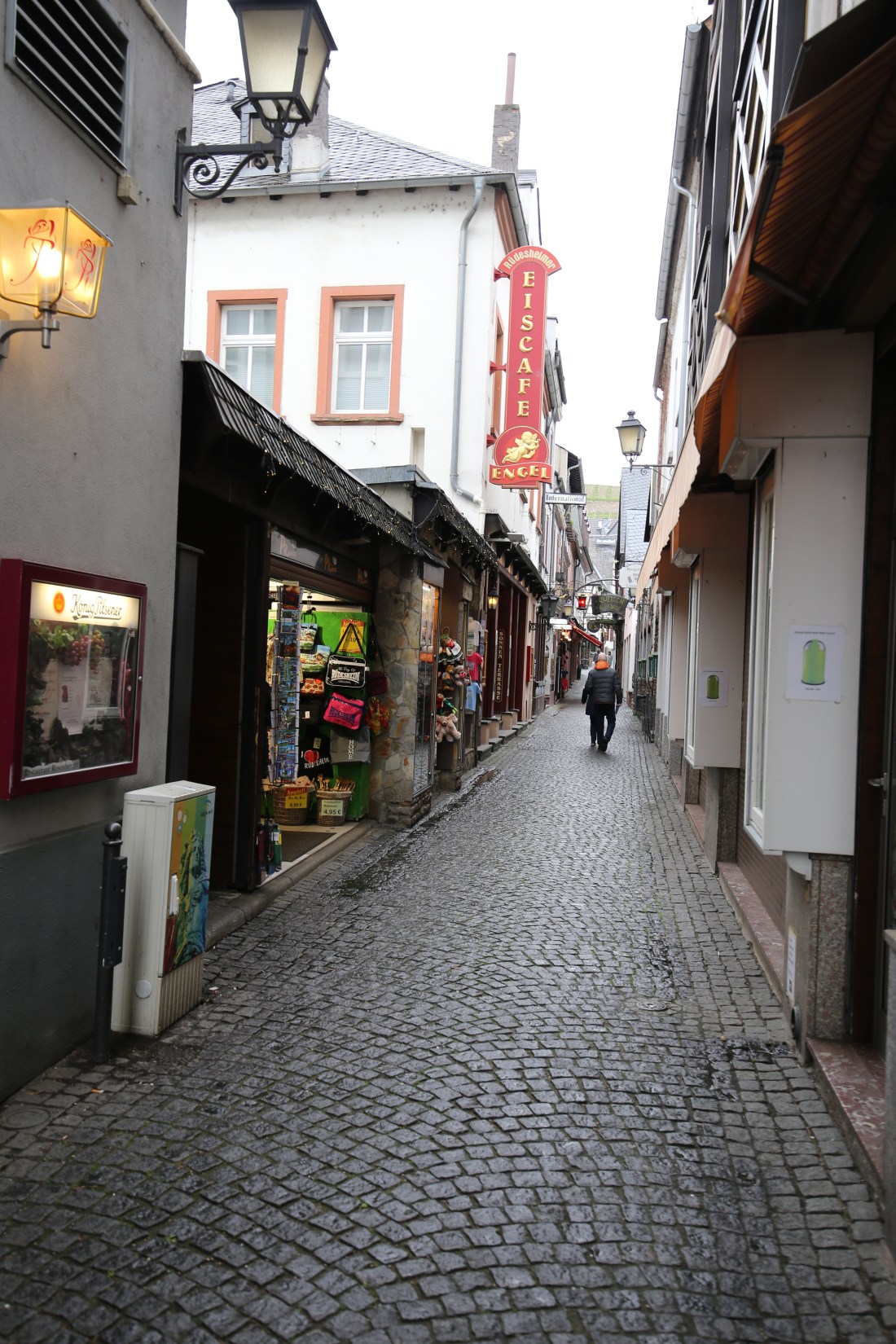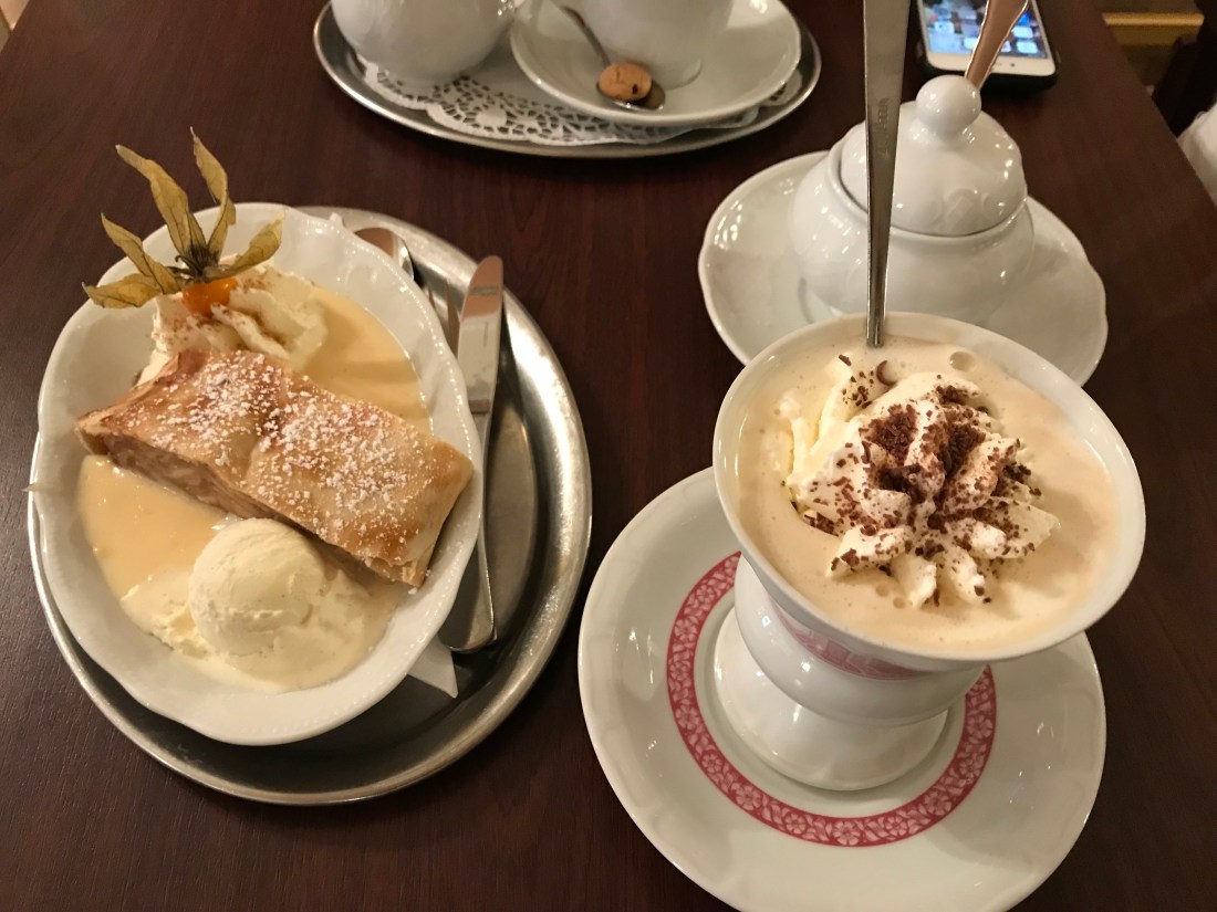 When we left the museum, it started to rain so we went to Eis Cafe Engel on a side street to enjoy the special Rüdesheim coffee made with brandy. It cost us 18 Euros for 1 special coffee, 1 regular coffee and 1 slice of apple strudel.