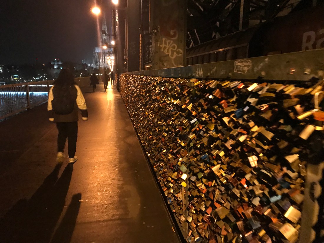 After the show, it was only 10:30 pm, so we headed out to take some awesome night shots of Cologne and walked around the cathedral area for a little bit. We felt safe even after midnight in the area. We crossed the bridge and walked to the opposite side of the river to take the pictures. Look at all these locks on the bridge!!