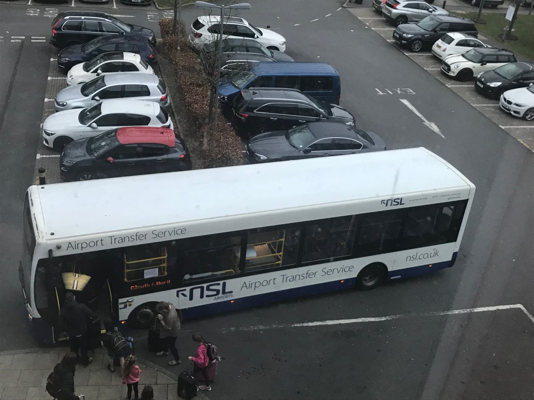 Although it was an easy 15-minute walk to the South Terminal where we could take the shuttle train to the North Terminal, we chose to pay £3 each for the Airport Transfer bus to take us all the way to the North Terminal where our flight departed. The bus ran every 20 minutes directly from the hotel & we just paid on the bus.