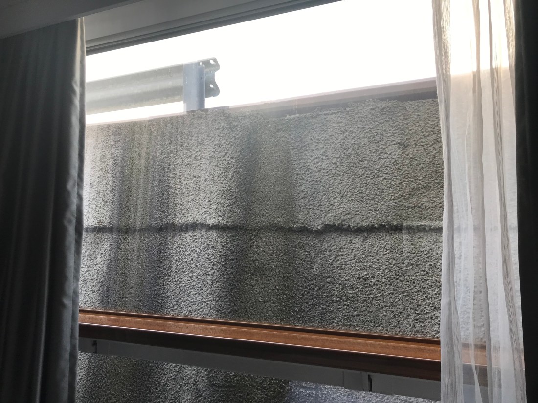 As soon as I woke up and opened the curtain, a very disappointing sight appeared…we docked with our side against the dock and our view was completely blocked by the concrete. Next time we have to book a deck 3 room to minimize such views!!