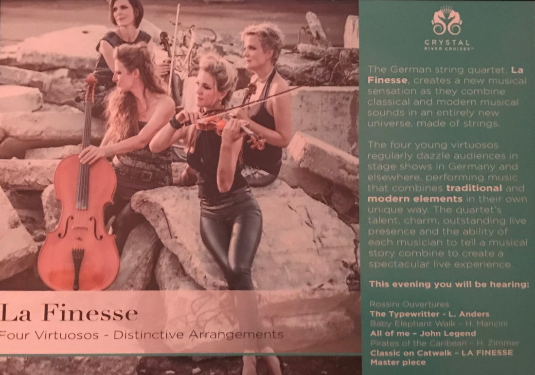The boat arrived at Koblenz at around 7 pm. After a quick buffet dinner, we boarded the Crystal coaches to attend the Crystal Signature Event: Sonic Bliss in the Gateway to the Gorge at the Electoral Palace in Koblenz performed by the string quartet, La Finesse.