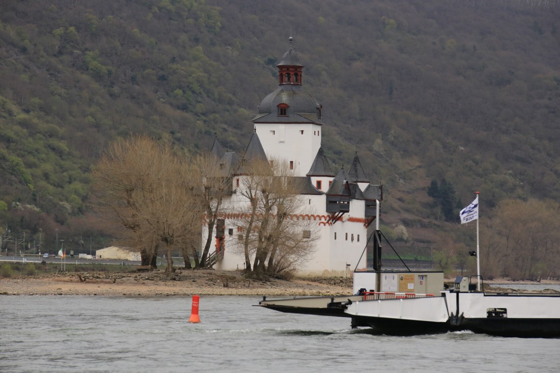 Cruising along, there was a castle right in the middle of the Rhine on an island, the Pfalzgrafenstein Castle. Pfalzgrafenstein Castle is a toll castle on the Pfalz Island in the Rhine river near Kaub, Germany. Our boat sailed right beside this picturesque and unique setting.
