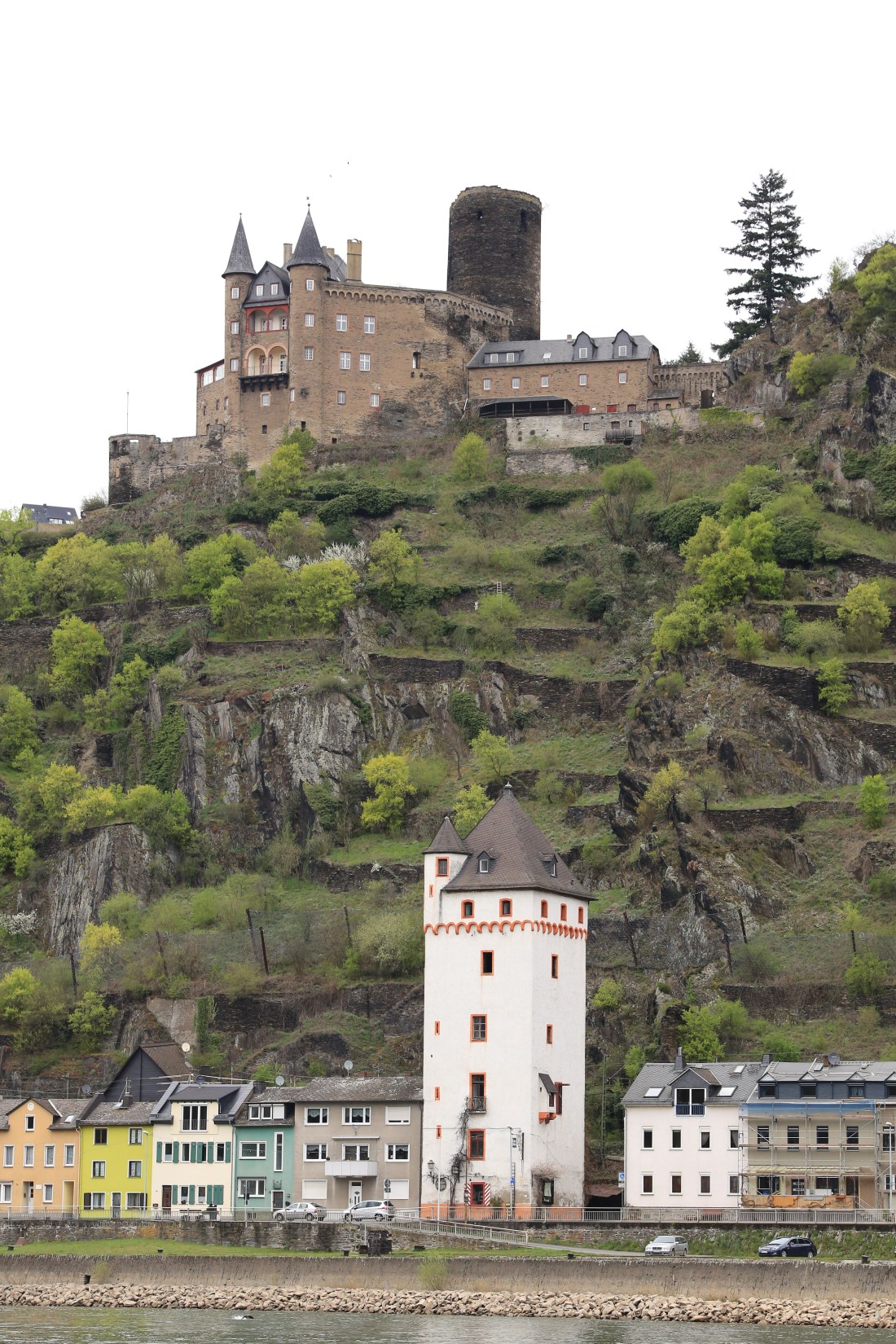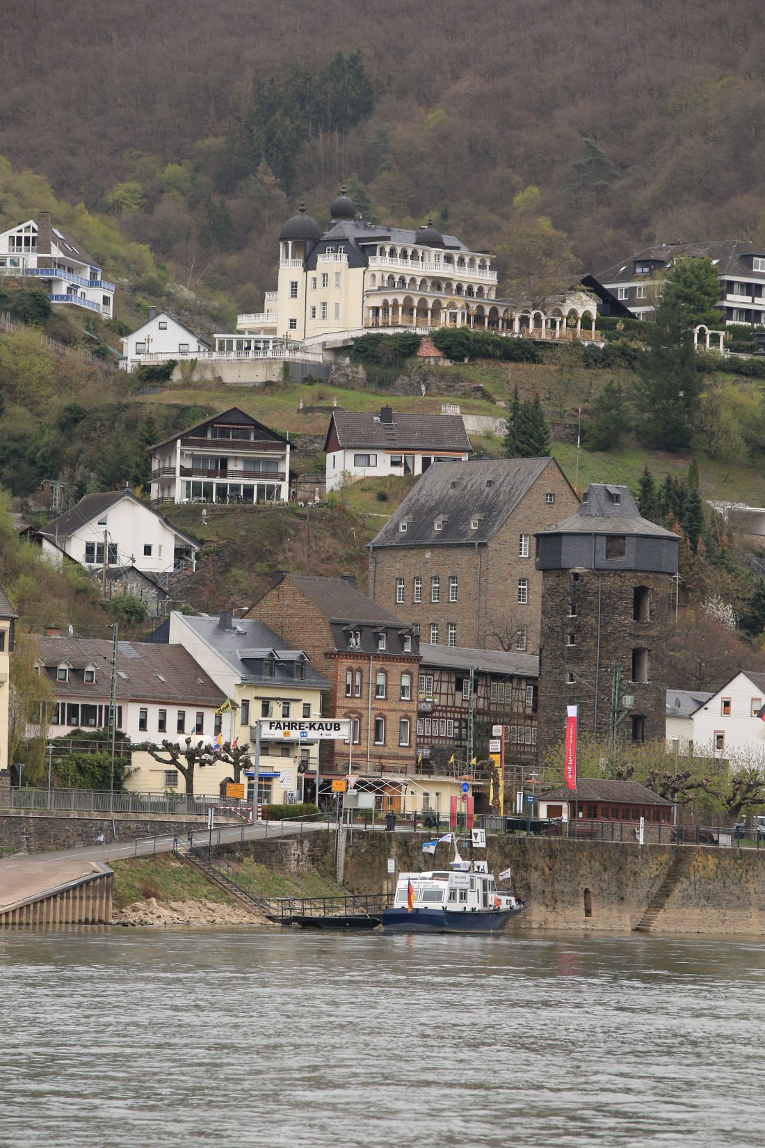I was looking very hard to find the Loreley Statue but couldn’t see it anywhere, even with the help of the binoculars. The Loreley Rock is a 132 m high, steep slate rock on the right bank of the River Rhine in the Rhine Gorge. This historically treacherous river bend has been associated with a legend that Loreley committed suicide here and her spirit distracted sailors with a sound or siren that led to shipwrecks. The Rhine at this point is up to 82 feet deep but only 371 feet wide. The we reached St. Goarshausen and saw the Katz Castle.